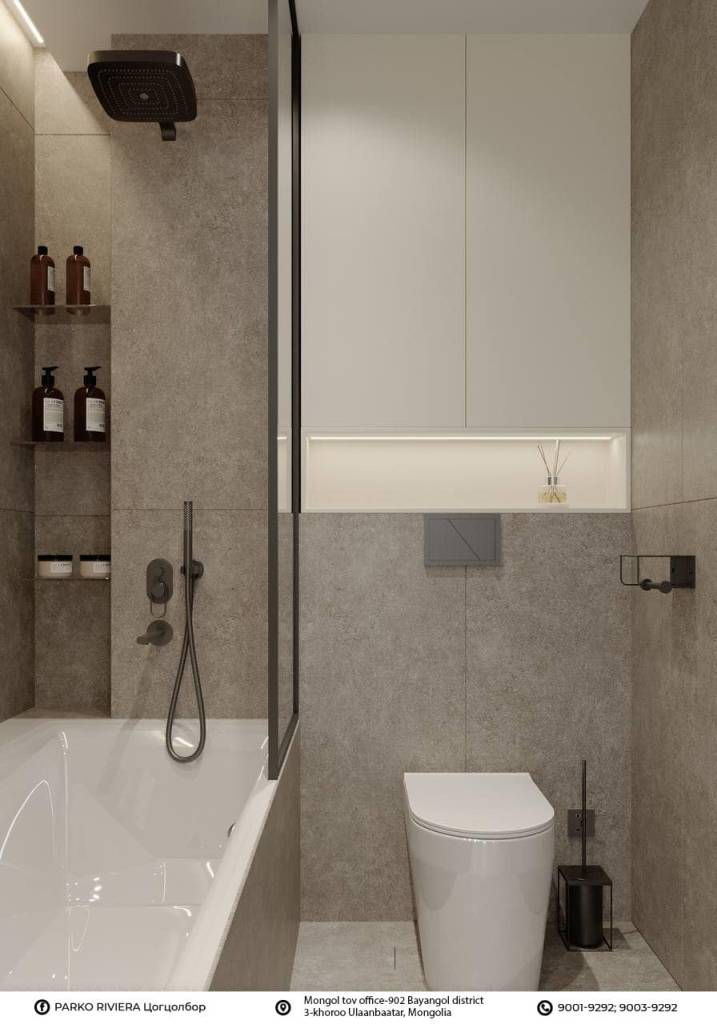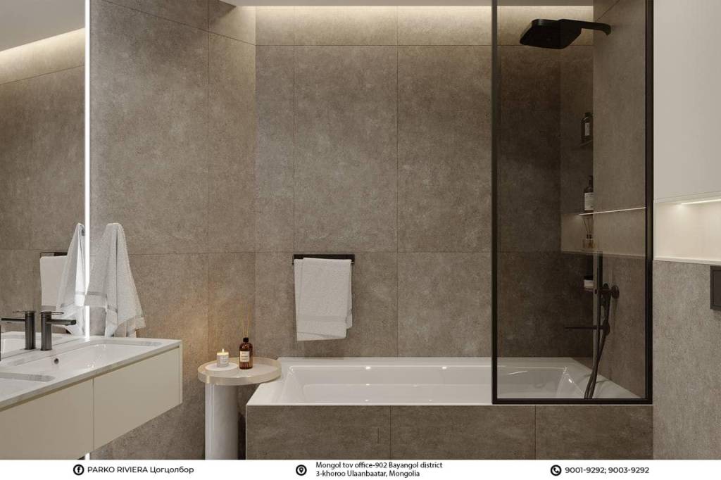 Нийтийн хэсгүүдэд Италийн Atlas Gress-ийн porcelain чулуун хавтанг ашигласнаар бараан өнгийн суурьтай, гүн мэдрэмж бүхий тансаг уур амьсгалыг бүрдүүлж, элэгдэл даах өндөр чанарыг хангаж өгсөн.